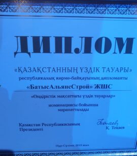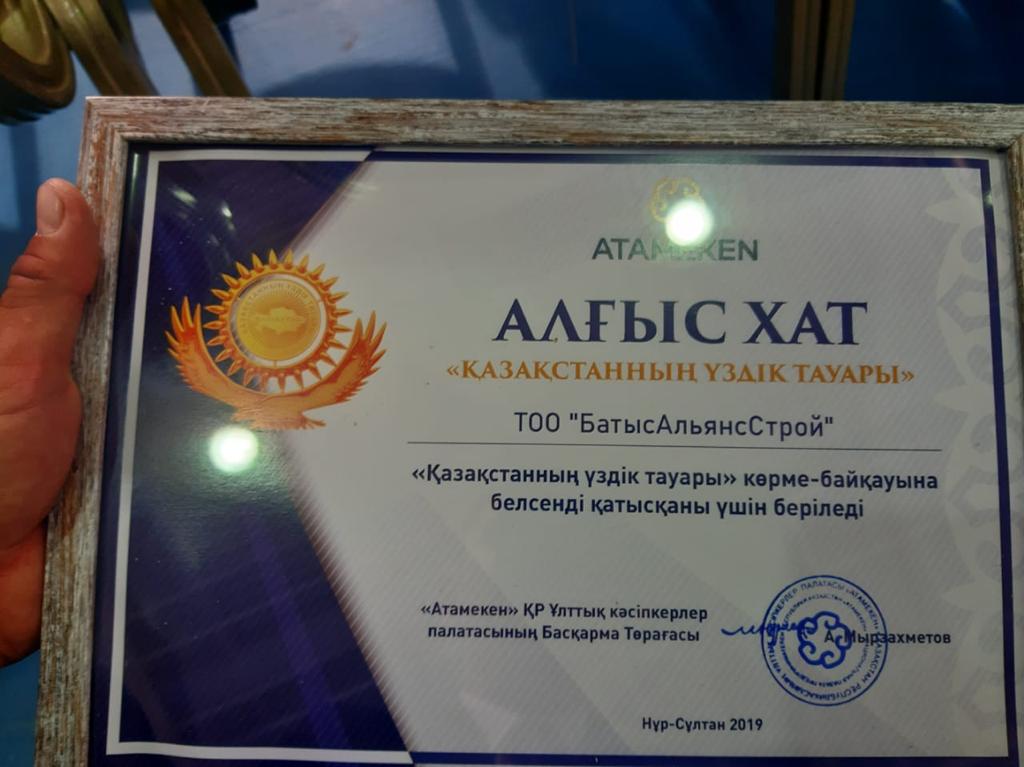 ТОО «БатысАльянсСтрой» в июне т.г. став одним из победителей по  итогам регионального конкурса «Лучший товар Казахстана»  в номинации «Лучшие товары производственного назначения» среди товаропроизводителей Атырауской области, достойно представила нашу область на республиканском конкурсе «Лучший товар Казахстана» в г.Нур-Султане  11-12 октября, который проходил  в выставочном центре «Көрме».